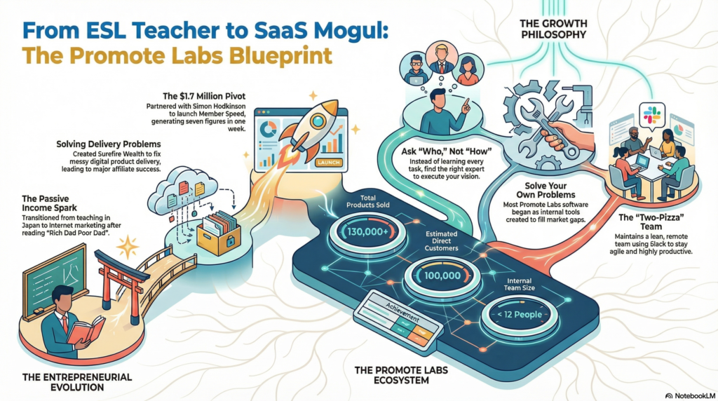 This interview features Jeremy Gislason, the co-founder of Promote Labs, detailing his professional journey from teaching English in Japan to becoming a successful digital entrepreneur. He explains how he and his business partner, Simon Hodkinson, built an expansive ecosystem of software-as-a-service solutions and information products while working entirely remotely. The discussion highlights their collaborative philosophy, which prioritises solving internal problems through software development and leveraging a small, efficient team to maintain high productivity. Gislason emphasises the importance of passive income, building mailing lists, and the shift from “how” to “who” when executing complex projects. Looking toward the future, he expresses a keen interest in Web3 developments, including blockchain and NFTs, as the next stage of their business evolution. Ultimately, the source serves as a guide on achieving professional freedom and scaling a digital brand through strategic partnerships and consistent innovation.